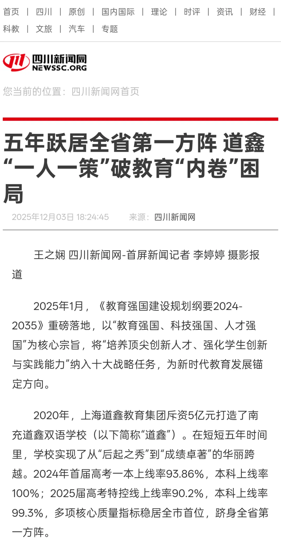 南充道鑫双语学校是由道鑫教育集团斥资5亿元在南充市新兴商业中心--嘉陵区白马湖畔新建的一所高起点、国际化的K12一体化精英教育双语学校,是百年巴蜀名校南充一中升级版。学校占地100余亩,建筑面积10万平米,拥有恒温游泳馆、健身中心、艺术中心、室内篮球综合馆、标准足球场、网球场、五星级学生公寓、全校史密斯直饮水系统、顶装理化生科学实验室、图书馆、30余个艺术、体育、STEAM功能教室等超一流学习成长空间。学校依托上海道鑫教育集团优质教育资产(上海英国学校浦东校区、南充一中、一中附小、一中附小欧香幼儿园),以培养站在未来中央、具有领袖气质和多元竞争力的精英学子为目标。